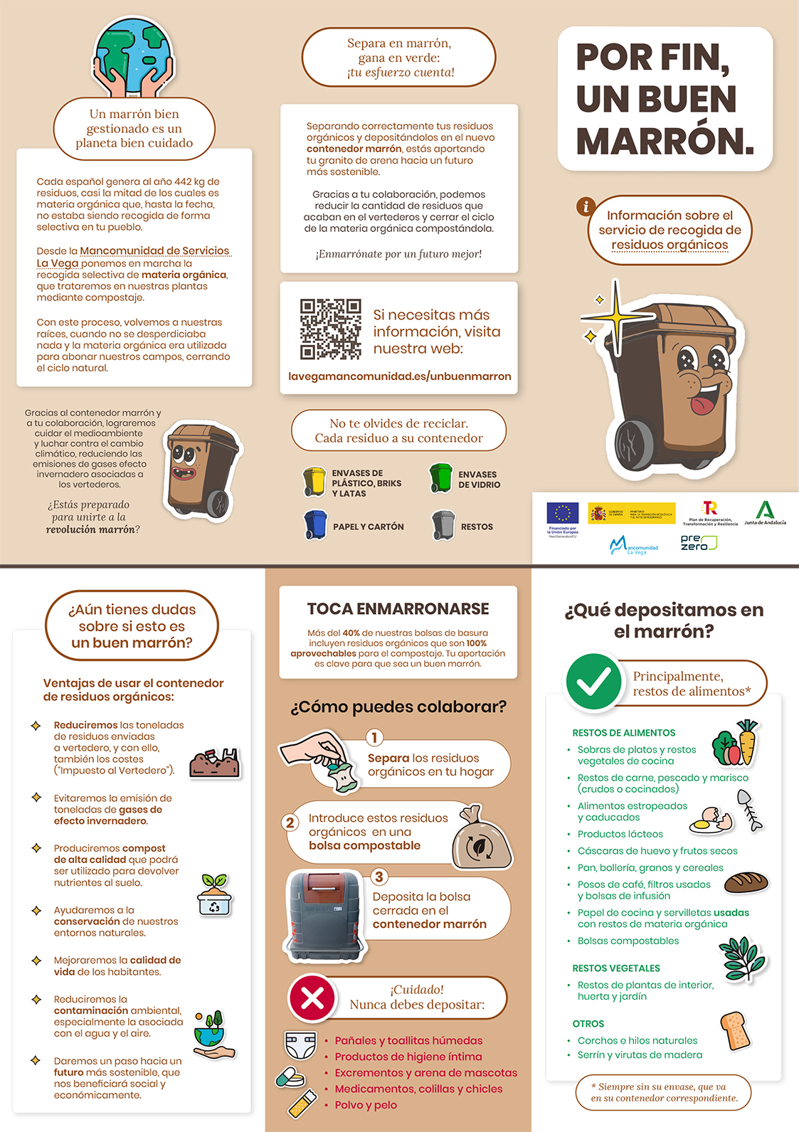 El Ayuntamiento ha puesto en funcionamiento, en colaboración con la Mancomunidad de la Vega, los nuevos contenedores marrones, destinados a los biorresiduos. Los beneficios de separar la materia orgánica son muchos y variados: