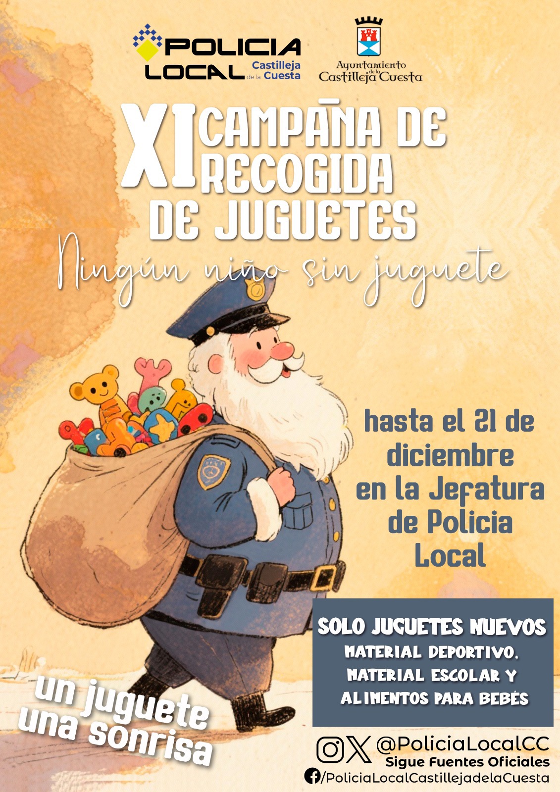 La Policía Local de Castilleja de la Cuesta impulsa, un año más, la exitosa campaña solidaria 'Esta Navidad, ningún niñ@ sin juguete'. La alcaldesa, Carmen Herrera, junto al delegado de Seguridad Ciudadana, Francisco Cordón, y el jefe de la Policía Local, Miguel Ángel Hidalgo, ha presentado esta campaña de donación de juguetes nuevos, material deportivo y escolar y alimentos para bebés y pañales, que lleva en marcha más de una década.