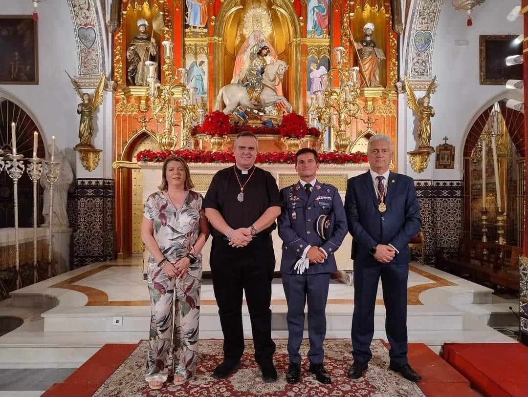 La delegada Ángeles Rodríguez asistió el pasado jueves 25 de julio a la Solemne Función Principal en honor a Santiago Apóstol, presidida por el párroco Alfonso José Filiberto del Castillo, y a la posterior procesión en su honor, junto al hermano mayor de la Hermandad de Santiago, Antonio Sánchez Mejías, y al Coronel Juan José Arbolí Nevot.