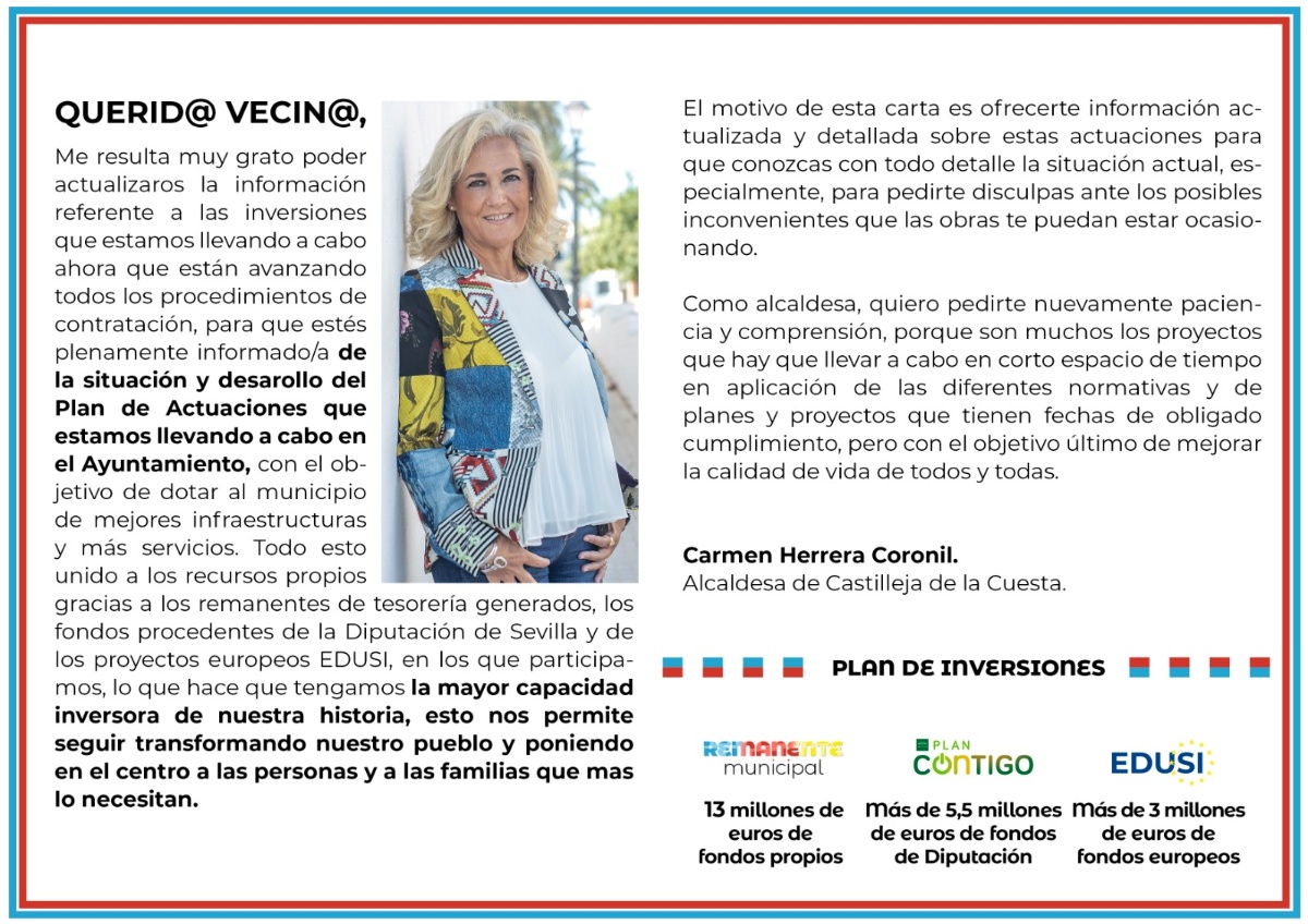 Castilleja de la Cuesta se ha convertido este año en uno de los municipios más inversores del Aljarafe: entre 2021 y 2023 se llevarán a cabo actuaciones, se impulsarán nuevos servicios y se reforzarán otros ya existentes por más de 15 millones de euros, gracias a las partidas procedentes del remanente municipal, del Plan Contigo de Diputación de Sevilla y de los proyectos EDUSI.
