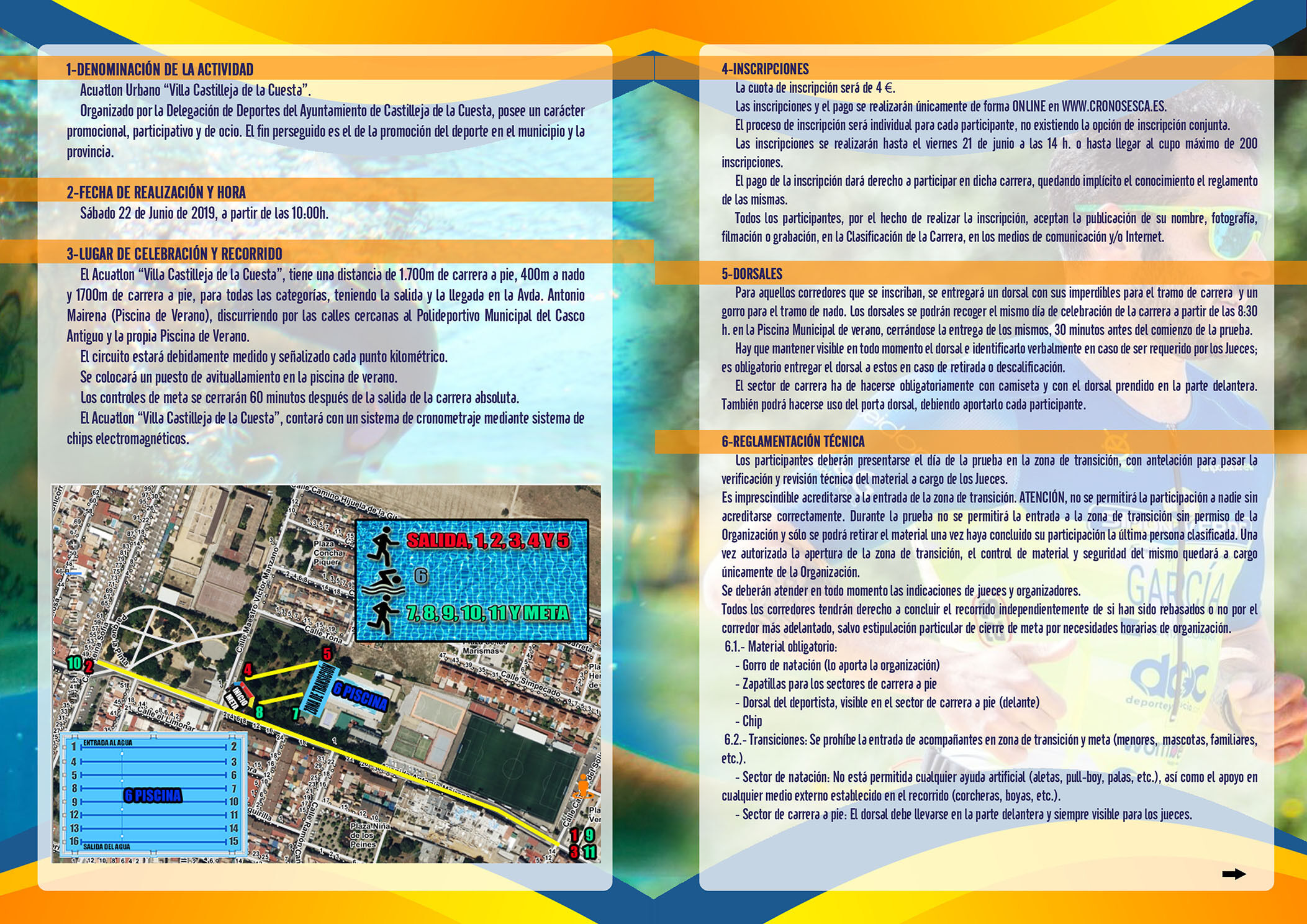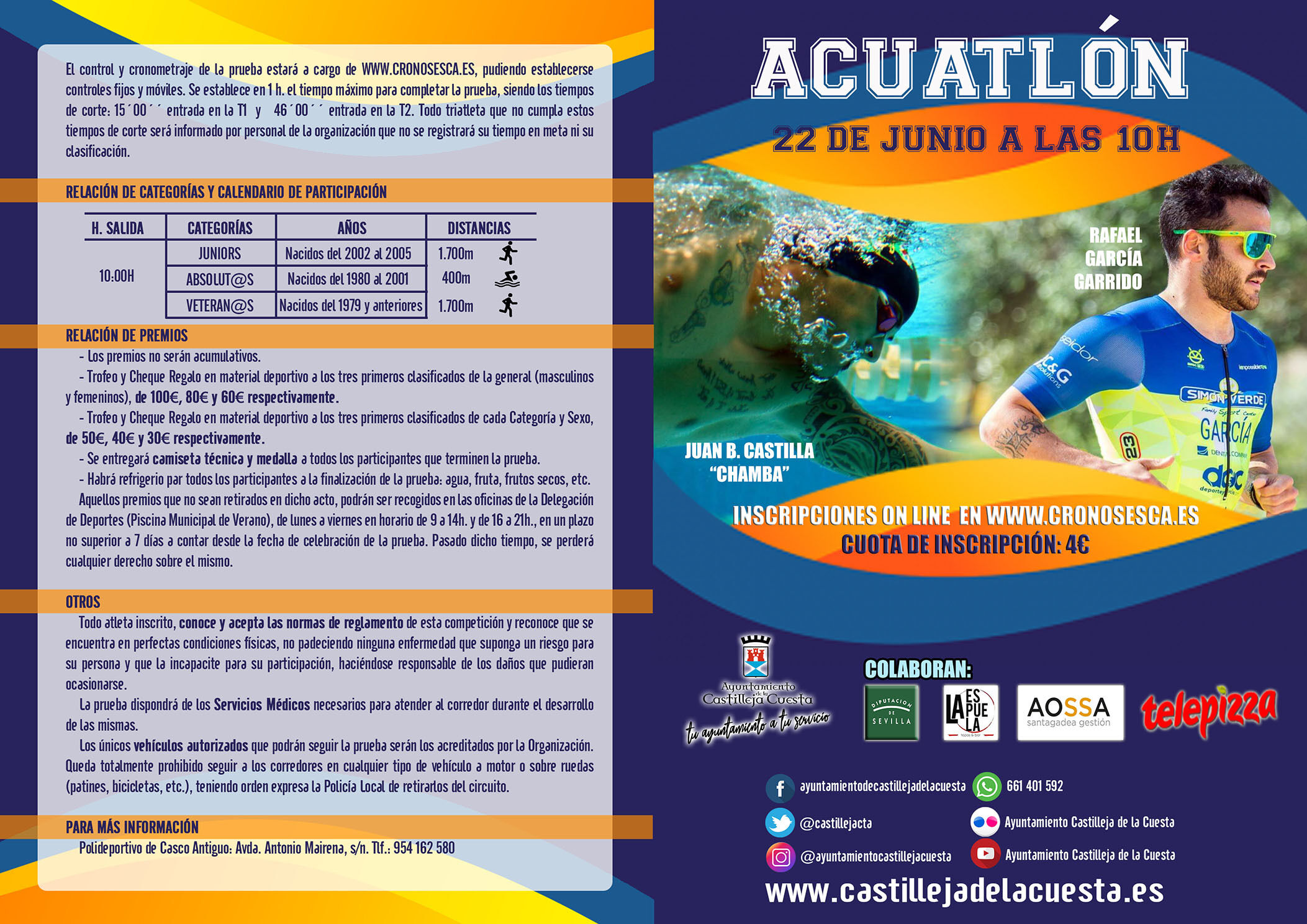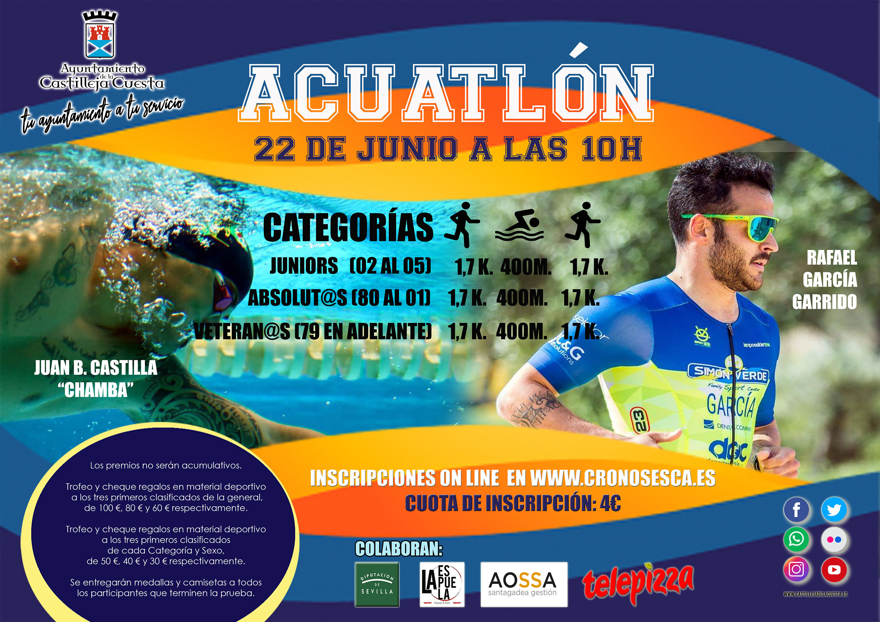 El Ayuntamiento de Castilleja de la Cuesta organiza el Acuátlon Urbano “Villa Castilleja de la Cuesta”, el próximo 22 de junio, a partir de las 10.00 horas. Ya está abierto el plazo de inscripciones a través de la web WWW.CRONOSESCA.ES