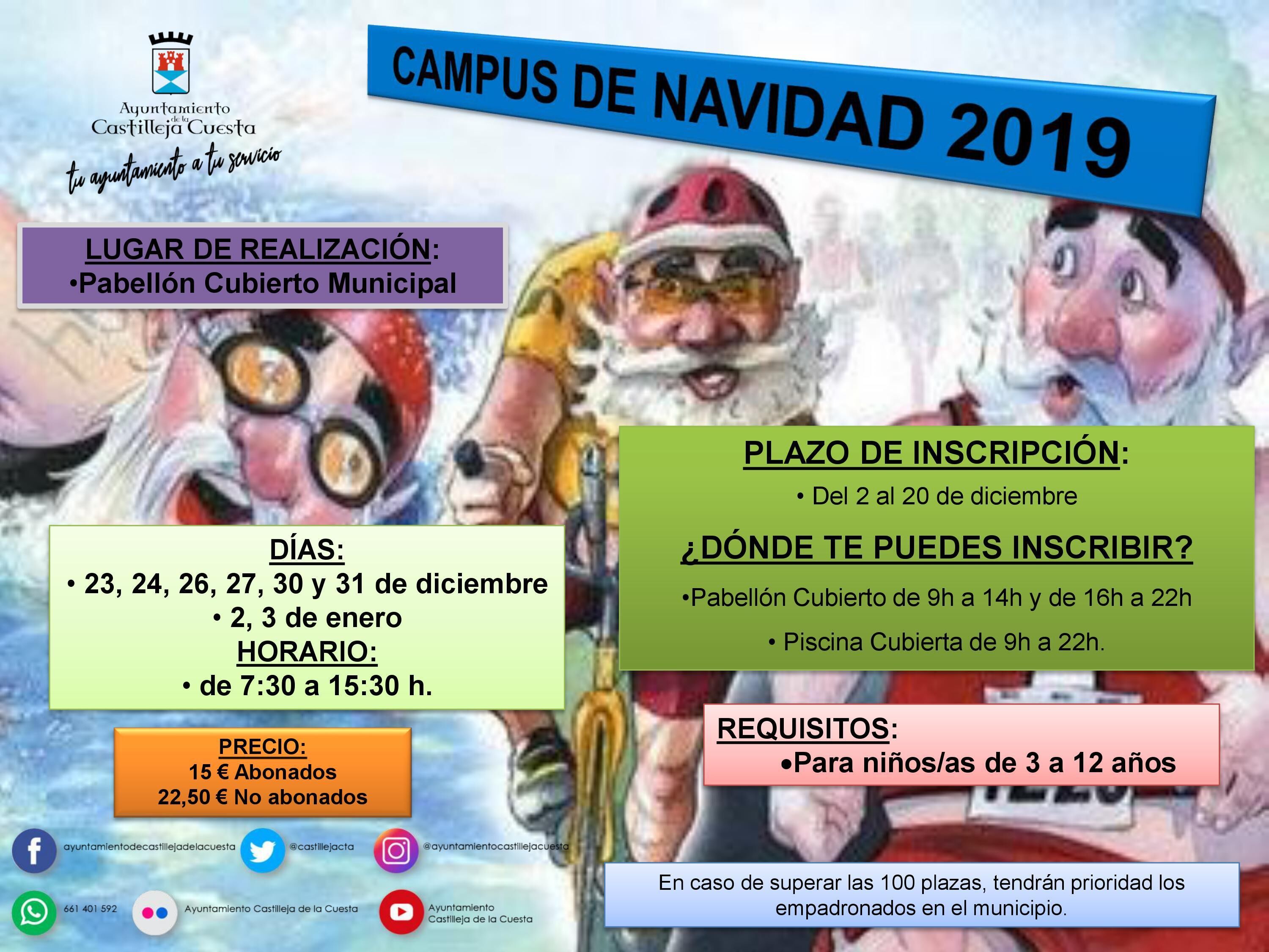 El Ayuntamiento volverá a poner en marcha, un año, más, el Campus de Navidad para facilitar la conciliación de la vida personal y familiar. Se pondrán en marcha actividades deportivas y educativas para que niños y niñas pasen unas vacaciones aprendiendo y compartiendo juegos.