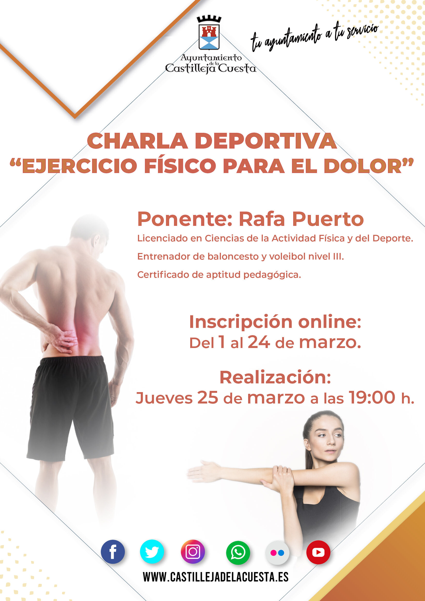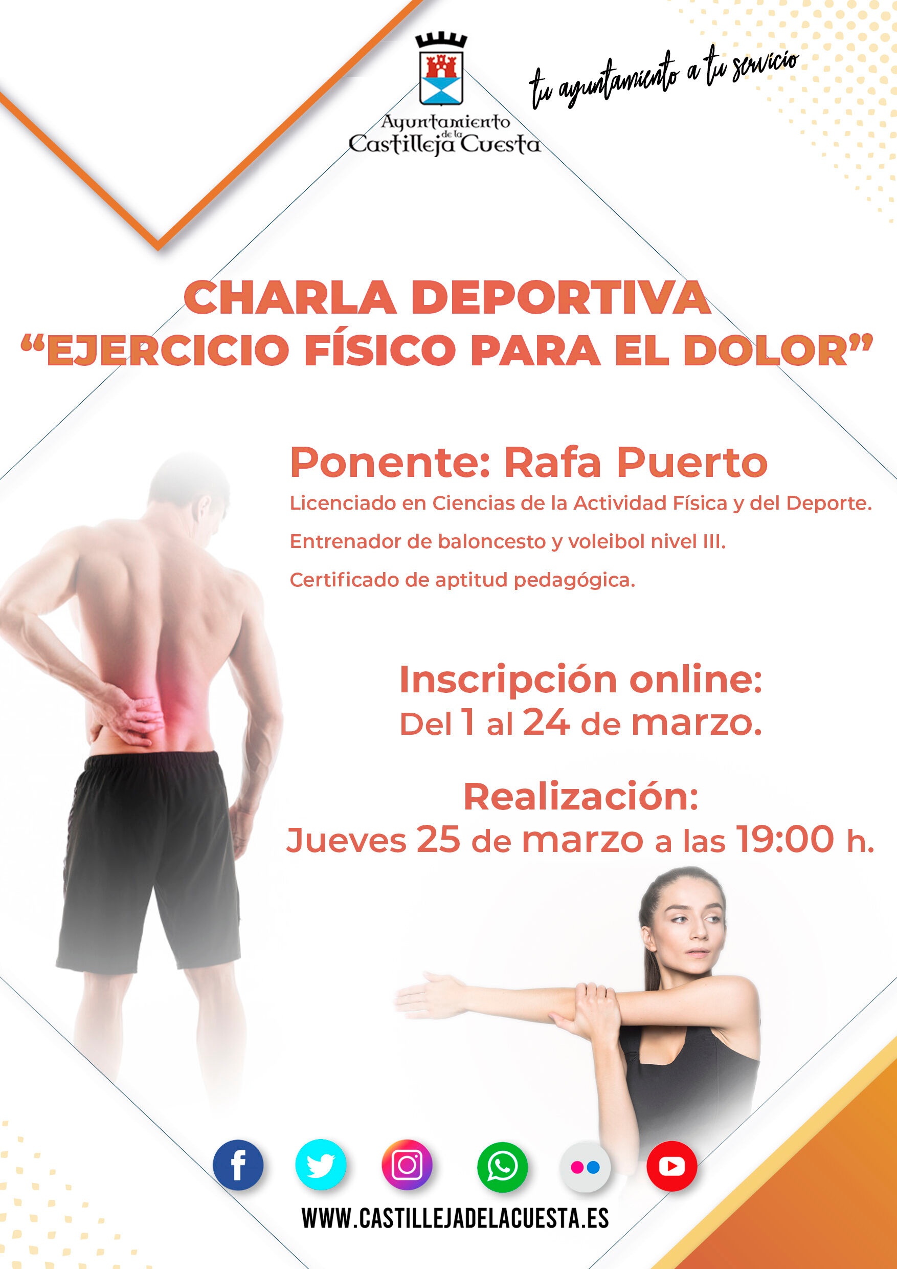 El Ayuntamiento organiza este mes de marzo una nueva charla sobre hábitos saludables y recomendaciones para la práctica deportiva. En esta ocasión, la conferencia tendrá como tema central: "Ejercicio físico para el dolor", a través de la cuál conoceremos cuales son los mecanismos de producción de beneficios para el dolor de los diferentes ejercicios físicos, además de los principales aspectos neurológicos del dolor.