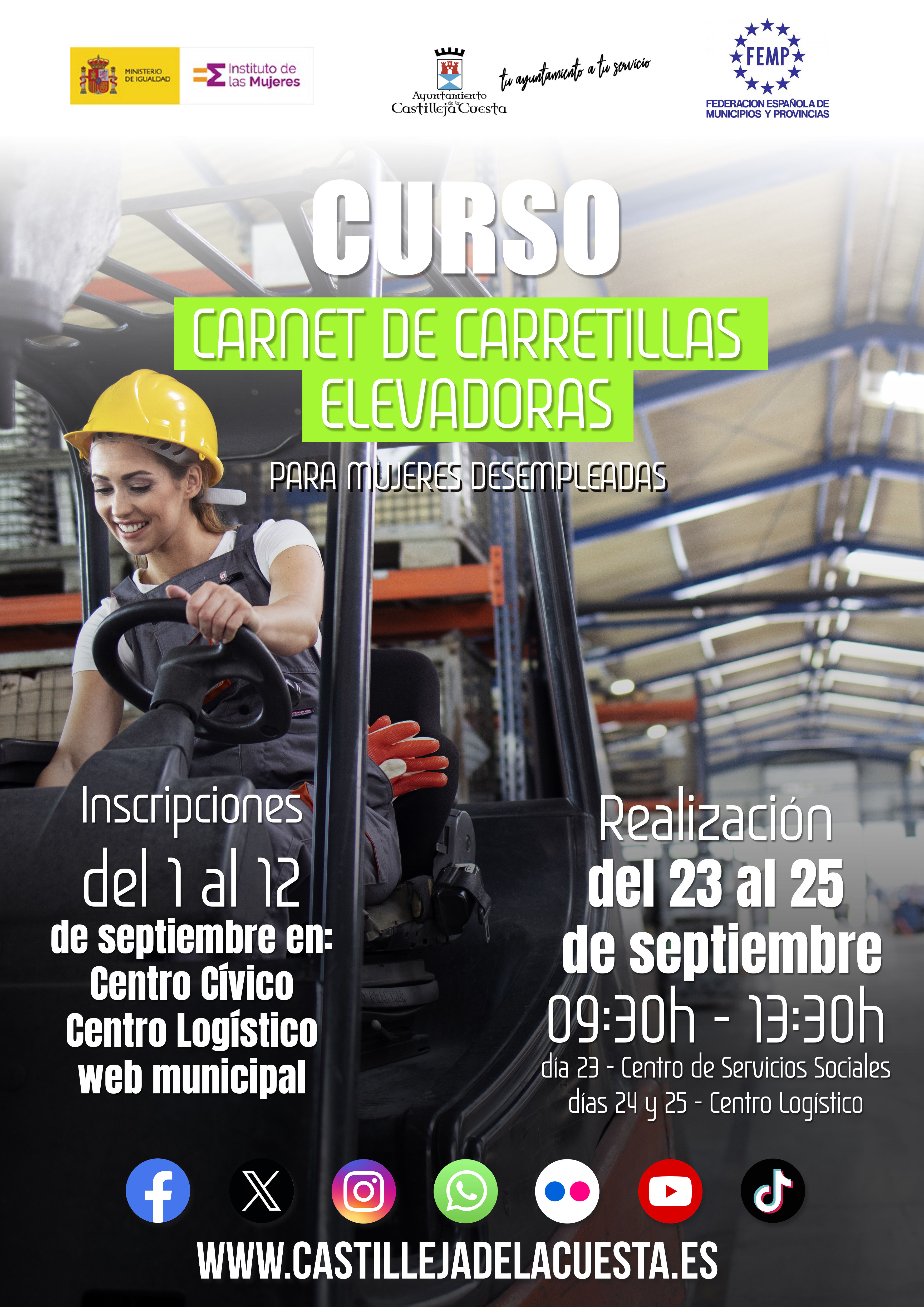 Las inscripciones estarán abiertas hasta el 12 de septiembre en el Centro Cívico y en el Centro Logístico de 8.30 a 14.30 horas o de manera on line, rellenando la solicitud y enviándola al correo igualdad@castillejadelacuesta.es