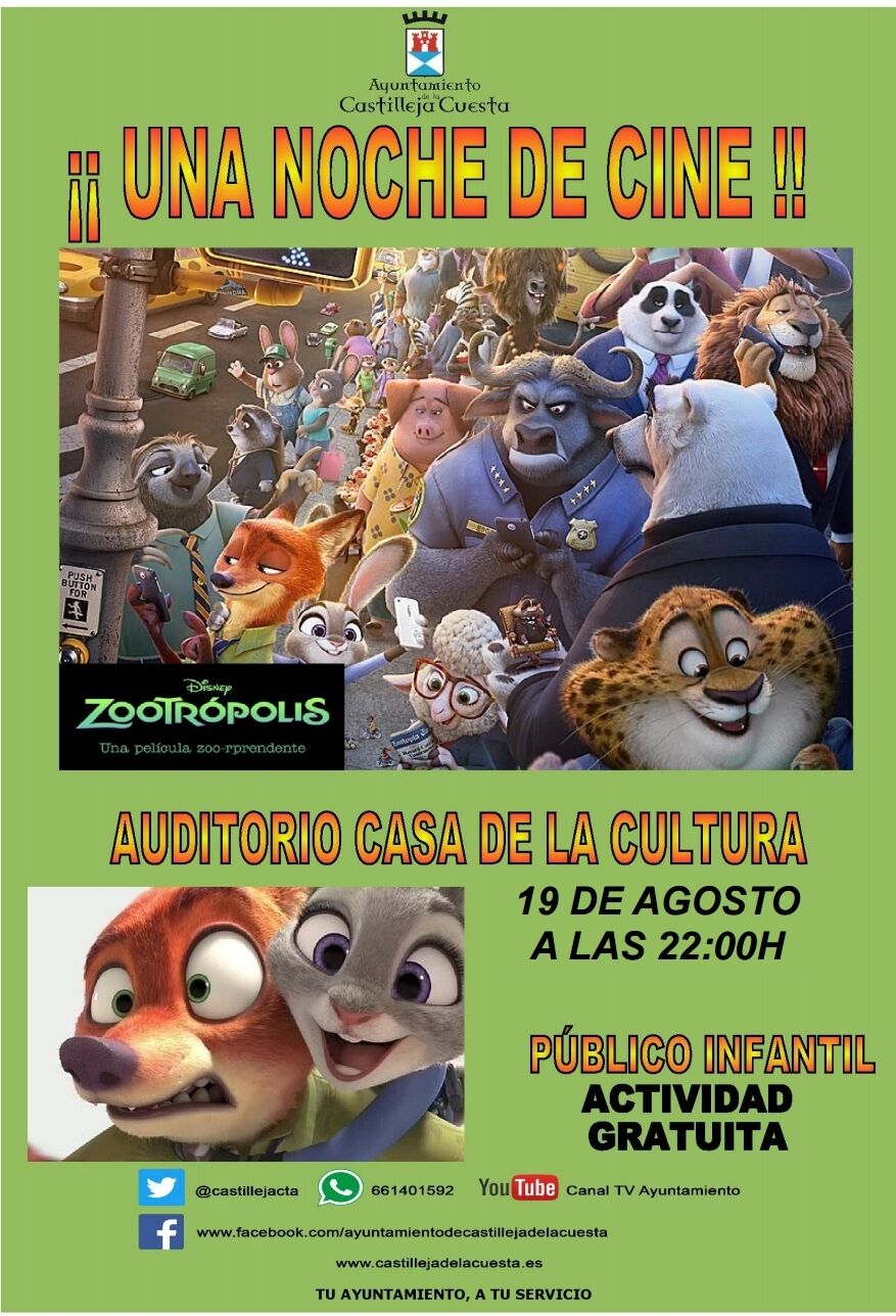 El próximo sábado 19 en el Auditorio de la Casa de la Cultura, a partir de las 22 horas, proyección de la película de animación Zootrópolis. Actividad gratuita.