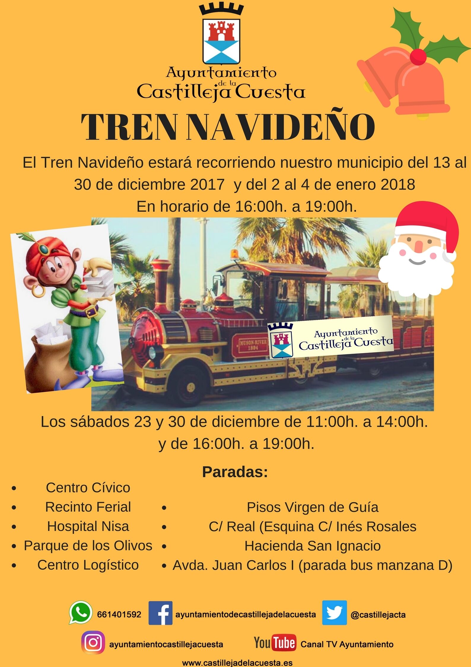 El Tren Navideño estará recorriendo nuestro municipio del 13 al 30 de Diciembre de 2017 y del 2 al 4 de Enero en horario de 16:00 a 19:00 h.