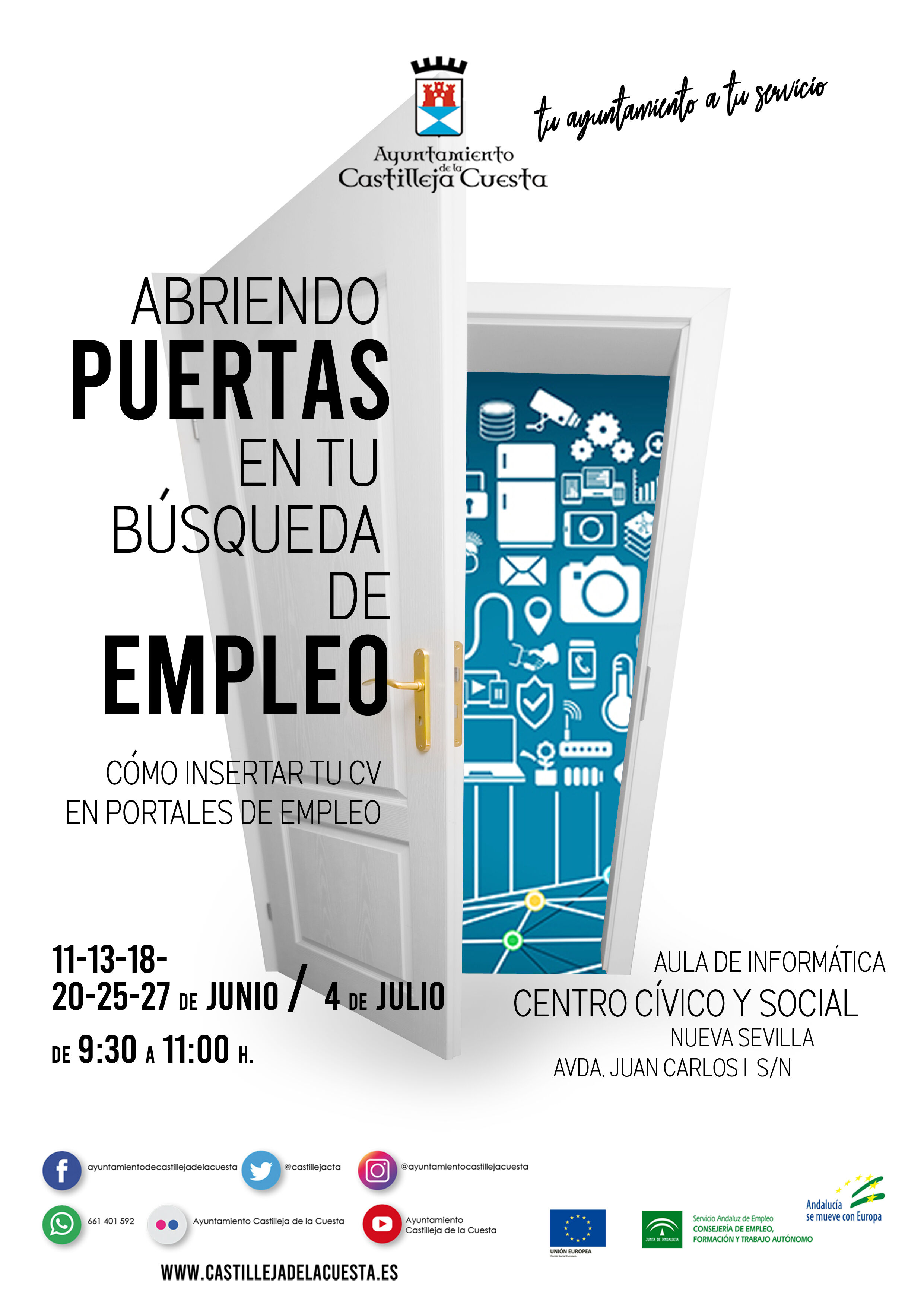 Taller 'Abriendo puertas en tu búsqueda de empleo (cómo insertar tu CV en portales de empleo)'. Días 11,13,18,20,25,27 y 4 de julio de 9.30 a 11.00 horas.