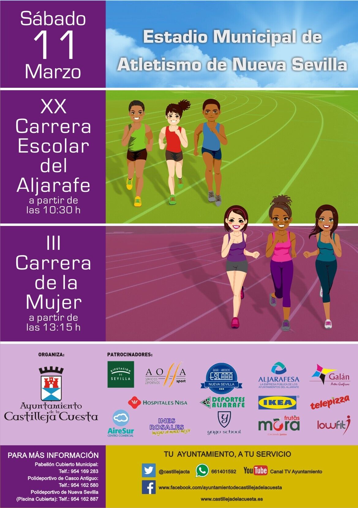El 11 de marzo de celebrará la III Carrera de la Mujer y la X Carrera Escolar del Aljarafe. Puede consultar aquí recorrido, bases, y solicitud de inscripción.