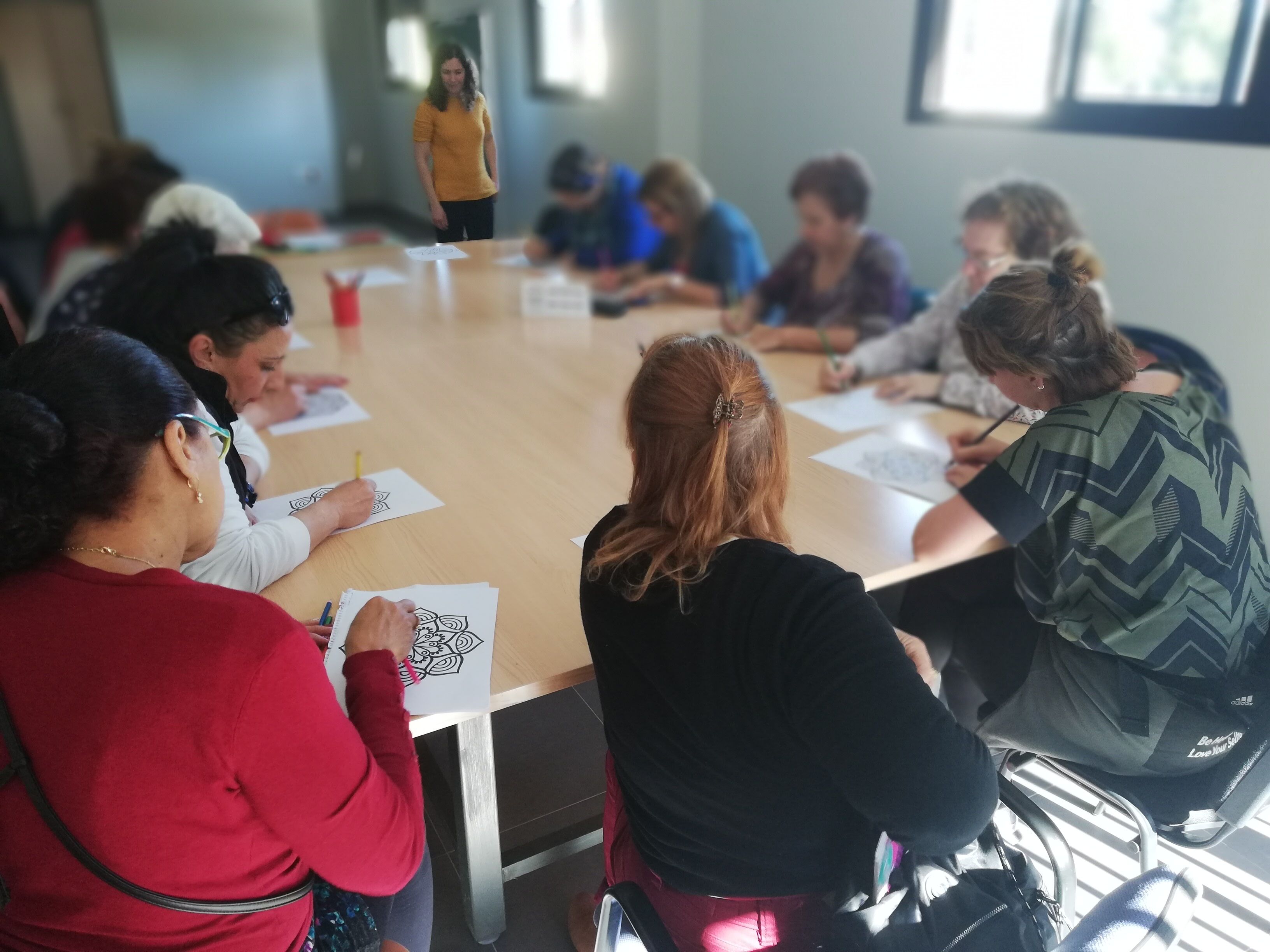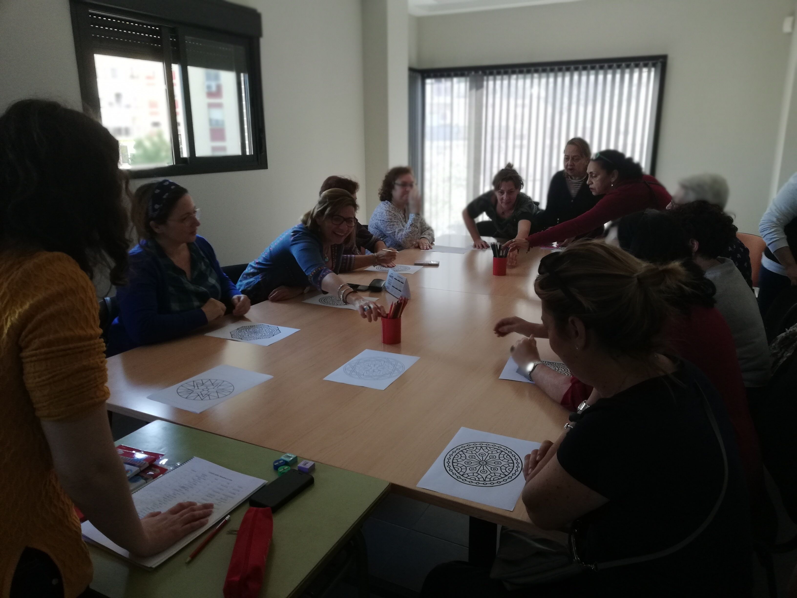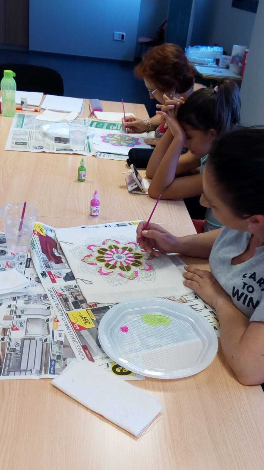 Esta formación se ha estructurado en dos partes: una teórica en la que se ha explicado a las participantes una breve historia y definición de los mandalas; y una segunda, que se ha centrado más en la práctica, poniendo a prueba las habilidades y destreza en el uso de esta técnica, utilizando telas y pinceles.