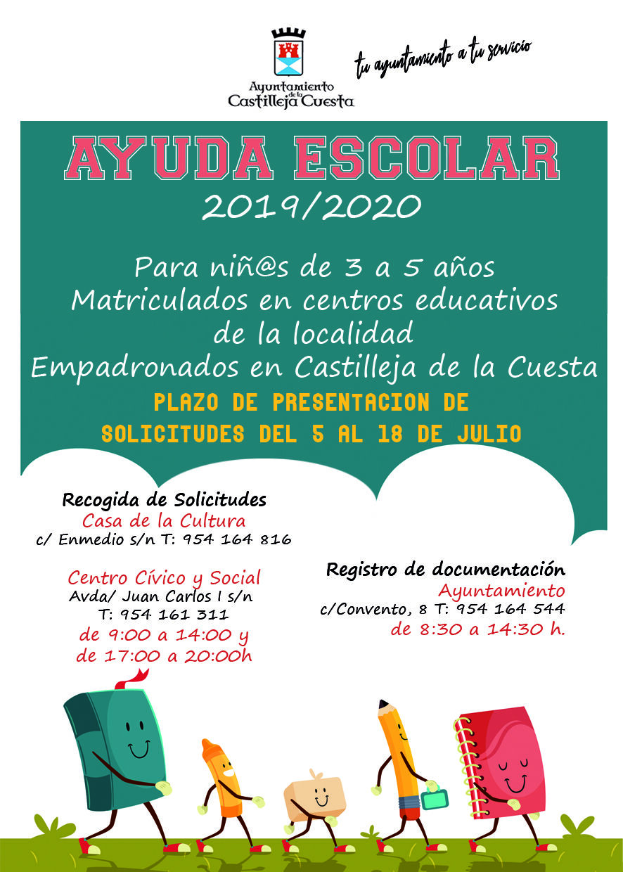El Ayuntamiento de Castilleja de la Cuesta abre el plazo de solicitudes de las ayudas escolares, dirigidas a niños y niñas de 3 a 5 años matriculados en el curso 2019-2020 en Centros Educativos de la localidad y que estén empadronados.