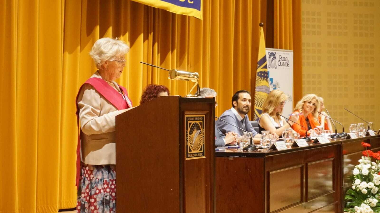 El acto estuvo presidido por la directora general de Igualdad, Cultura y Participación Social de la UPO, acompañada por el padrino de estas promociones Raúl Puente Asuero, profesor del Departamento de Geografía, Historia y Filosofía.