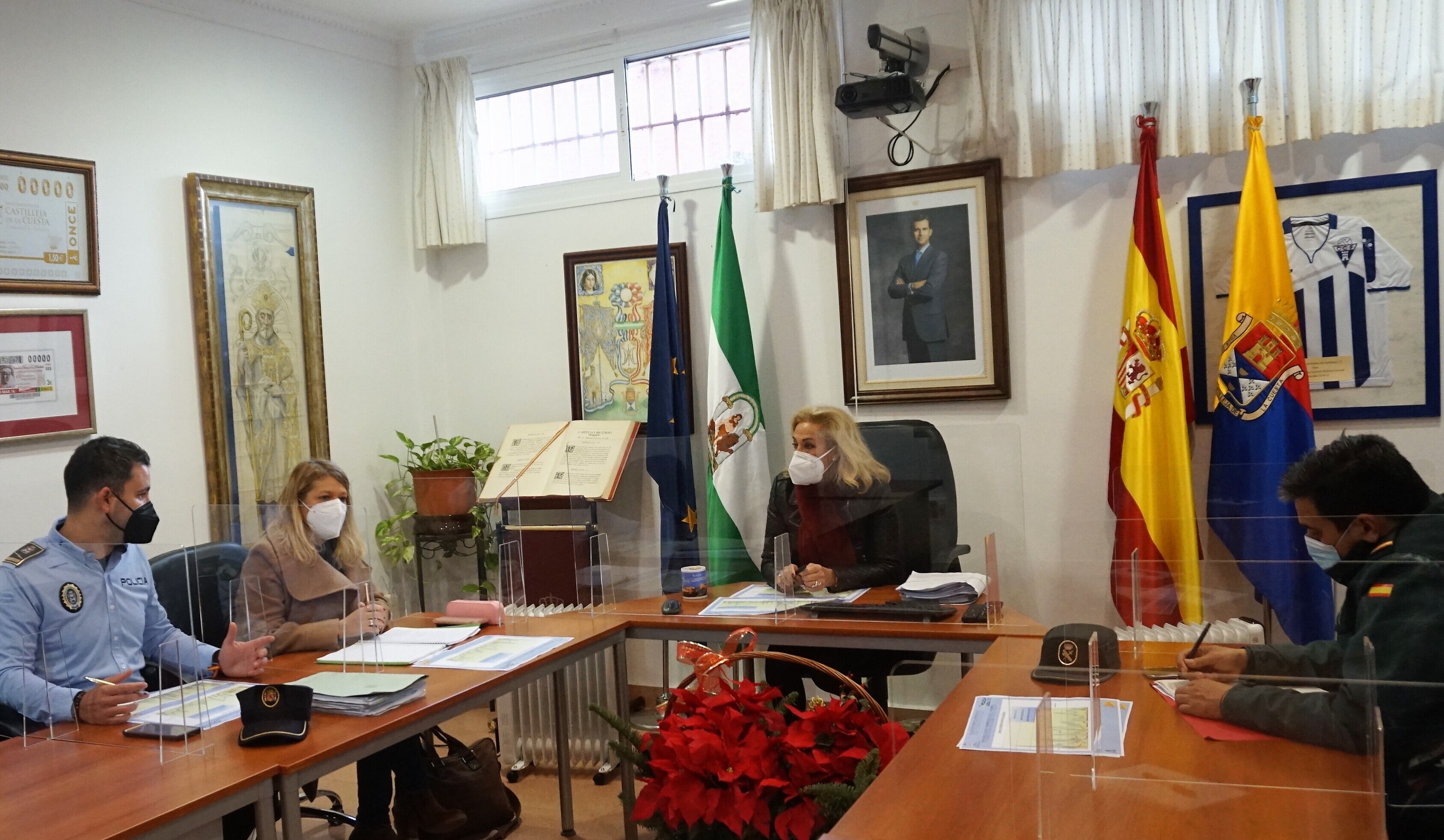 La alcaldesa, Carmen Herrera, acompañada de la delegada de Seguridad Ciudadana, Ángeles Rodríguez, ha reunido nuevamente al jefe de la Policía Local, Miguel Ángel Hidalgo, y al comandante de la Guardia Civil, Sergio Amado, para analizar el amplio dispositivo puesto en marcha en estos días de Navidad en Castilleja de la Cuesta.