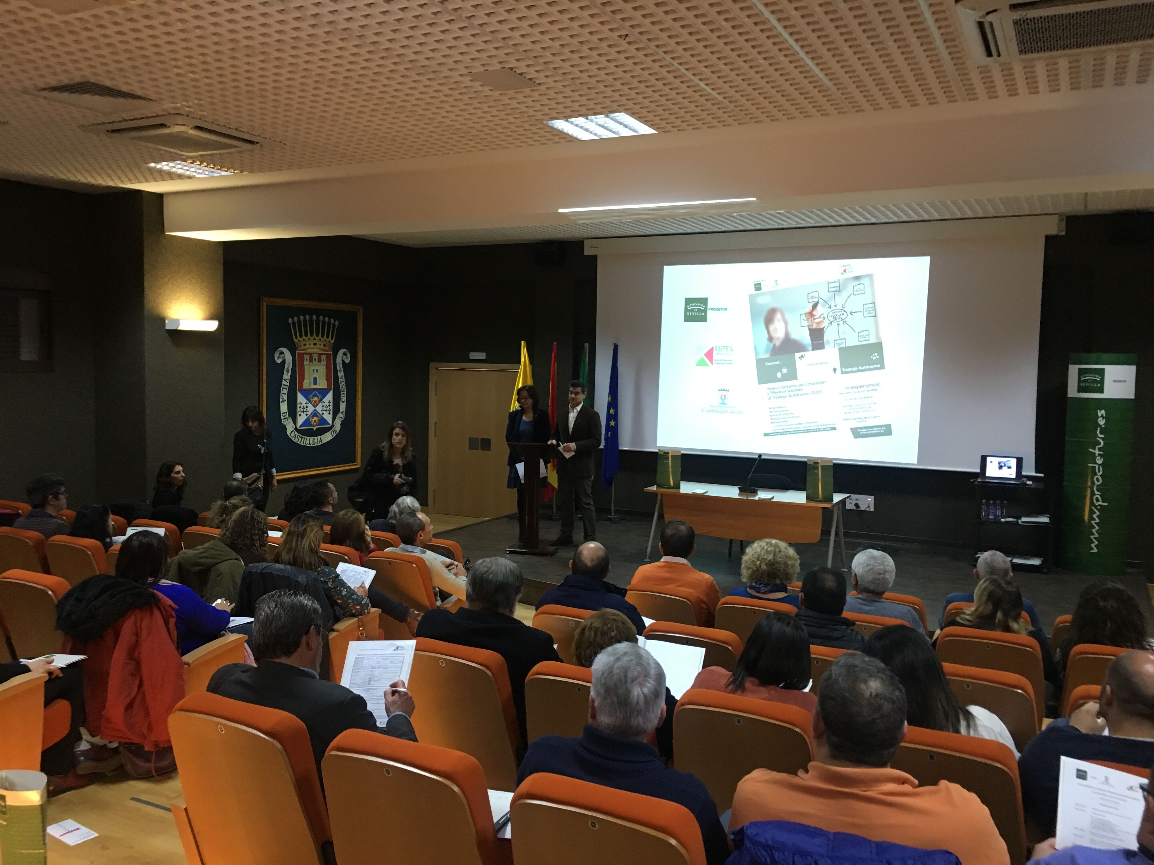 La alcaldesa, Carmen Herrera, el presidente de la Diputación de Sevilla, Fernando Rodríguez Villalobos, y la secretaria general de la Unión de Profesionales y Trabajadores Autónomos de Andalucía (UPTA Andalucía), Inés Mazuela, han participado en la jornada ‘Nuevo Sistema de Cotización y Mejoras Sociales para Autónomos’, que se ha celebrado en Castilleja de la Cuesta. La sesión estuvo organizada por Prodetur junto a la Unión de Profesionales y Trabajadores Autónomos de Andalucía (UPTA Andalucía) y el Ayuntamiento.