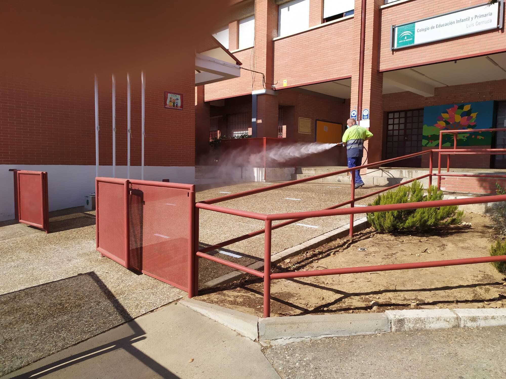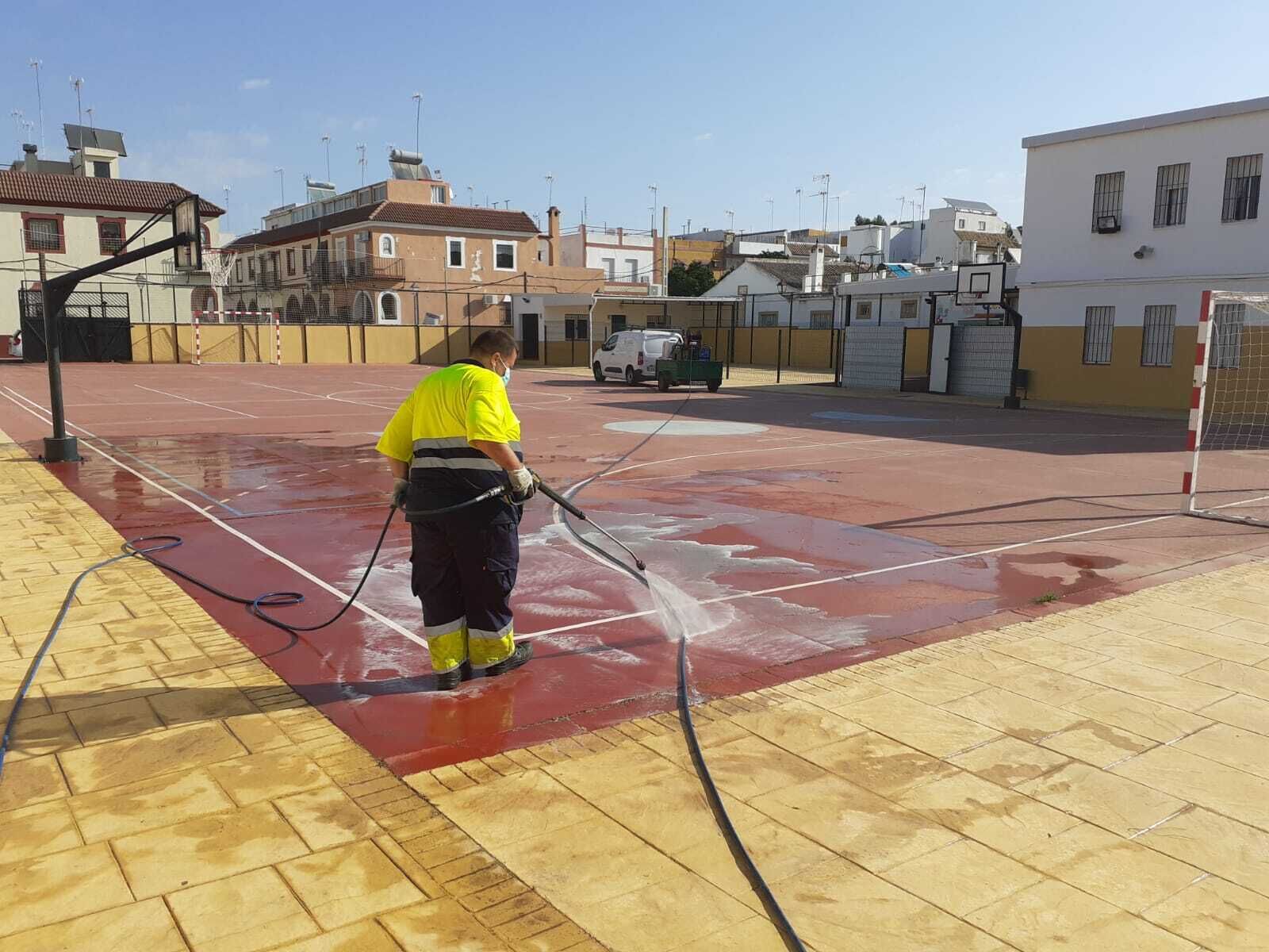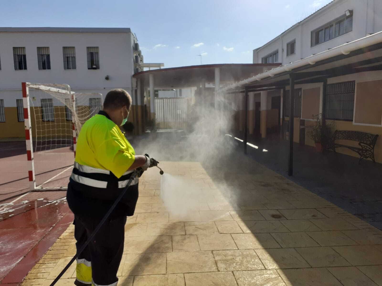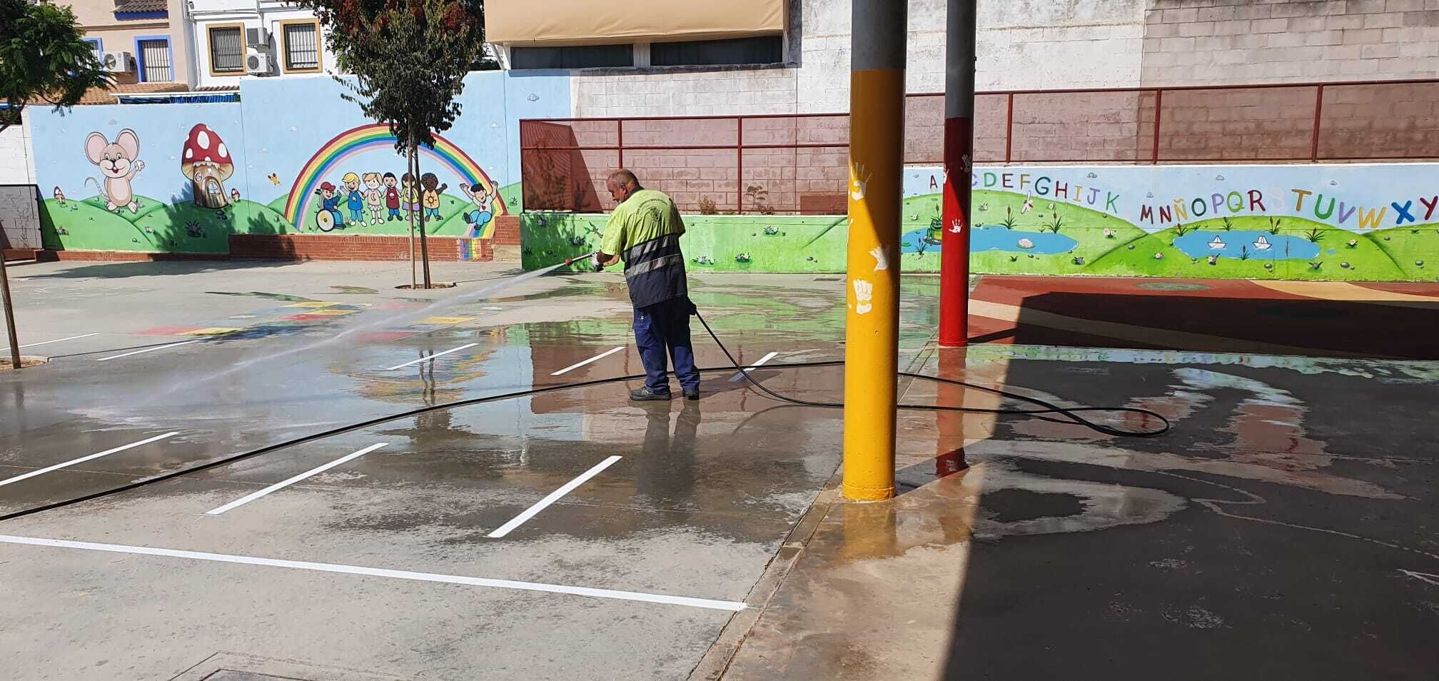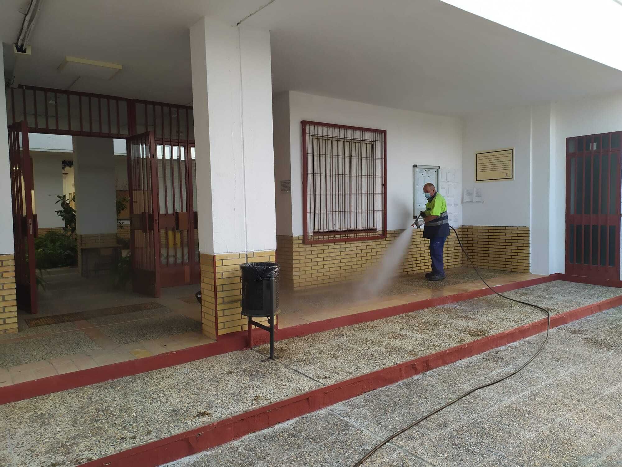 El Ayuntamiento desarrollará, como refuerzo adicional y de manera diaria, trabajos de baldeo, limpieza y desinfección de los accesos a los colegios de Castilleja de la Cuesta. De cara al inicio del curso que arranca mañana, ya hoy se han desarrollado actuaciones de desinfección en patios, zonas comunes y espacios aledaños a los centros para que todo esté listo de cara al inicio de las clases, y dentro del plan de medidas anunciado por la alcaldesa, Carmen Herrera, en agosto.