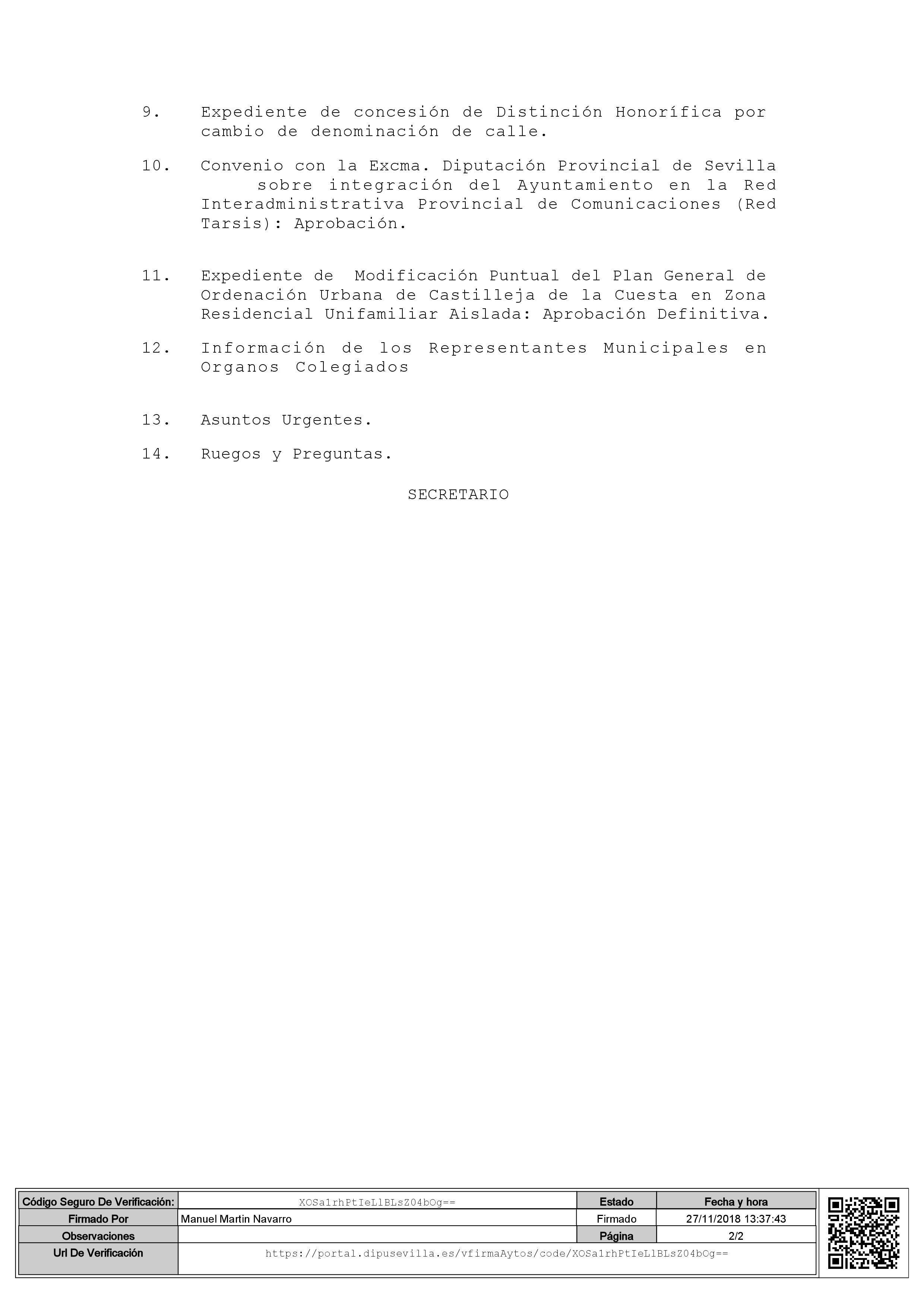 Convocatoria de Pleno Extraordinario de Castilleja de la Cuesta. Miércoles 7 de noviembre a las 8.30 horas.