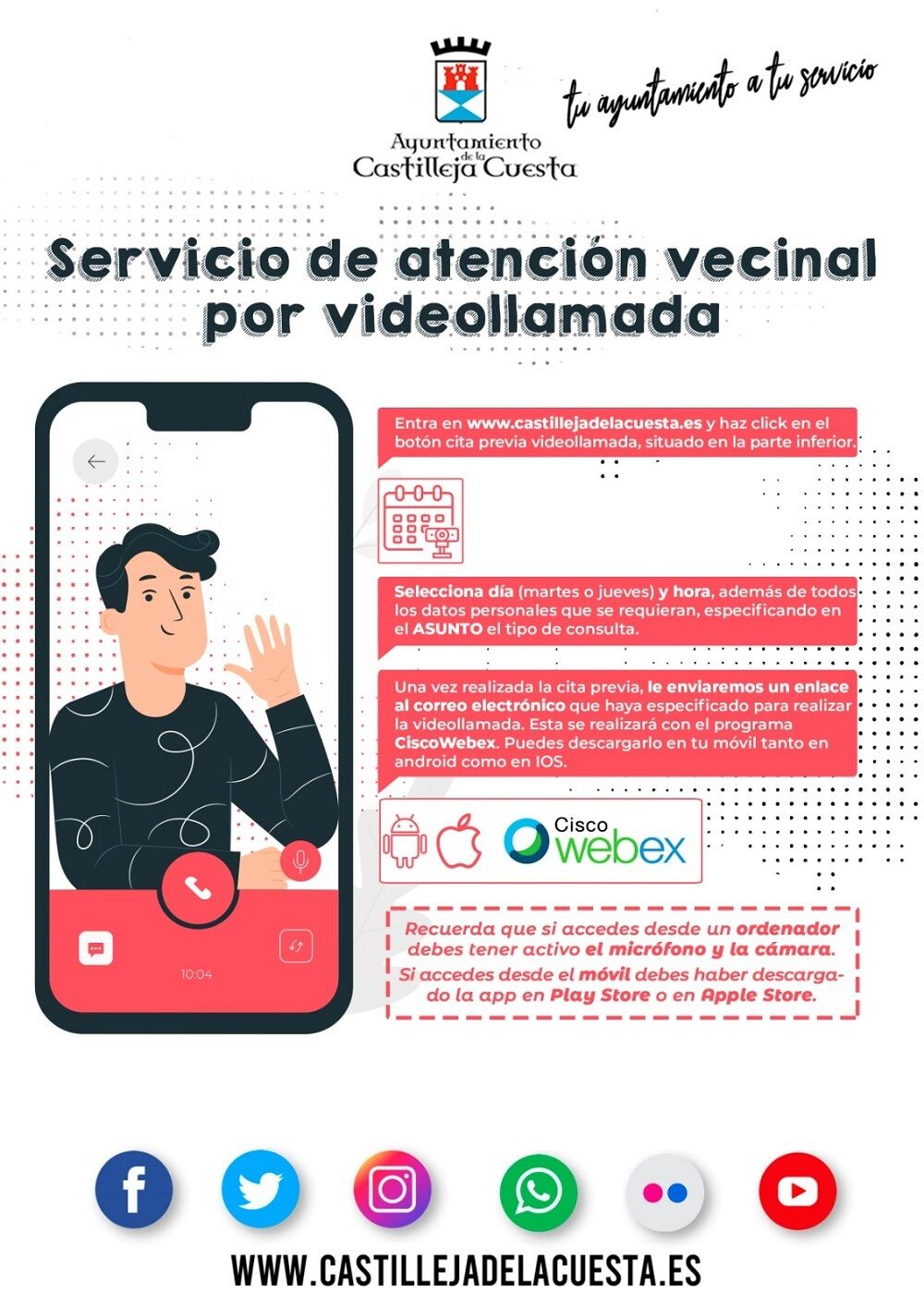 El Ayuntamiento activa un novedoso servicio de videollamada que refuerza la atención vecinal y permite la consulta no presencial a vecinos y vecinas. El objetivo es facilitar todas las herramientas necesarias para acercar la Administración al ciudadano/a, teniendo en cuenta, además, la actual crisis sanitaria.