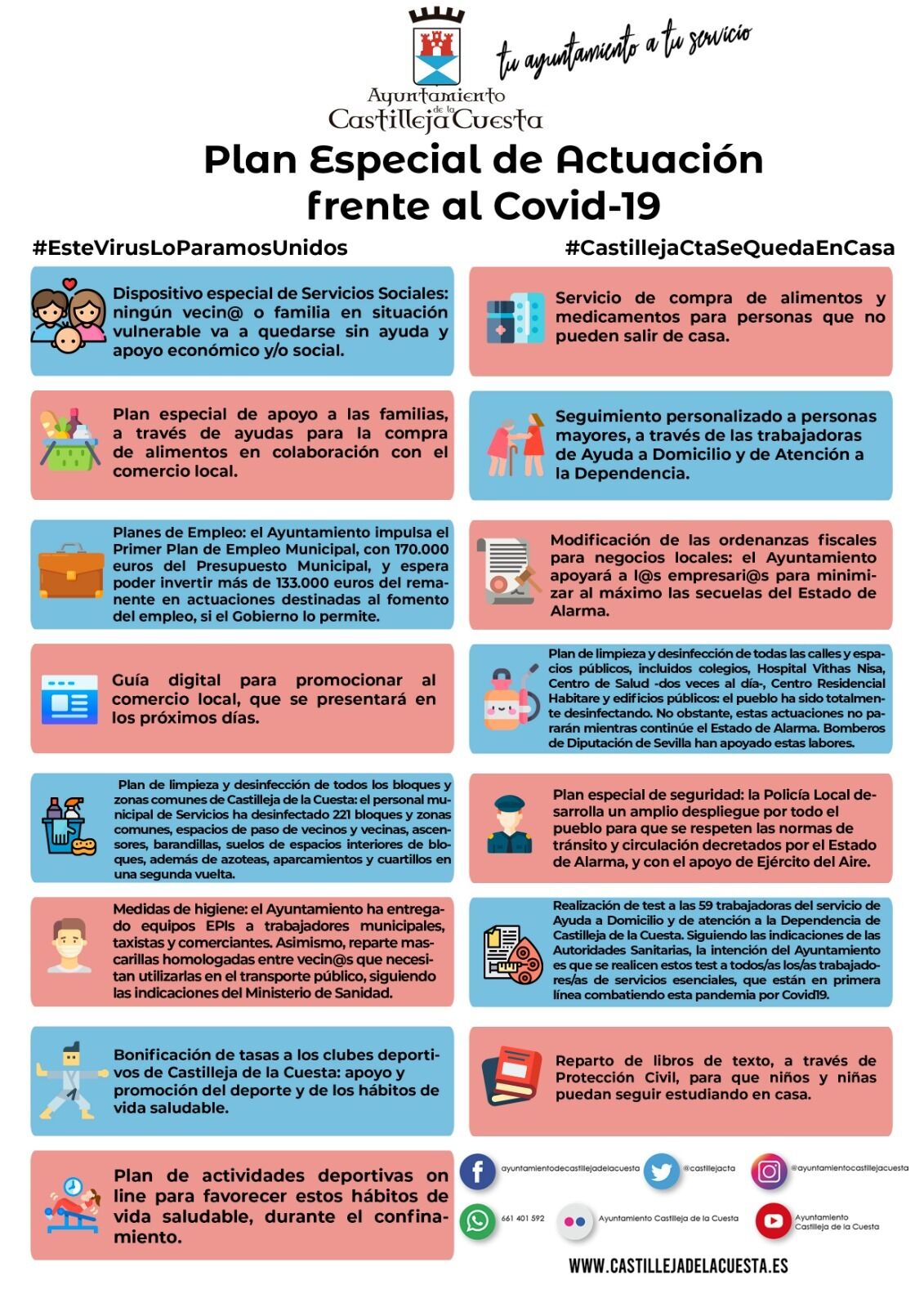 El Ayuntamiento de Castilleja de la Cuesta desarrolla desde el inicio del Estado de Alarma un Plan Extraordinario de Actuaciones que tiene como eje la atención a familias y colectivos más vulnerables, la seguridad y la limpieza y desinfección del municipio a través de un amplio dispositivo. Durante los últimos 50 días de confinamiento el Consistorio ha puesto en marcha un total de 15 medidas que tienen como objetivo fundamental paliar todas las consecuencias derivadas de la actual situación sanitaria, poniendo el foco en la atención social y económica a vecinos y vecinas con especiales circunstancias de vulnerabilidad y priorizando el gasto público en aquellas personas que más lo necesitan en las actuales circunstancias.