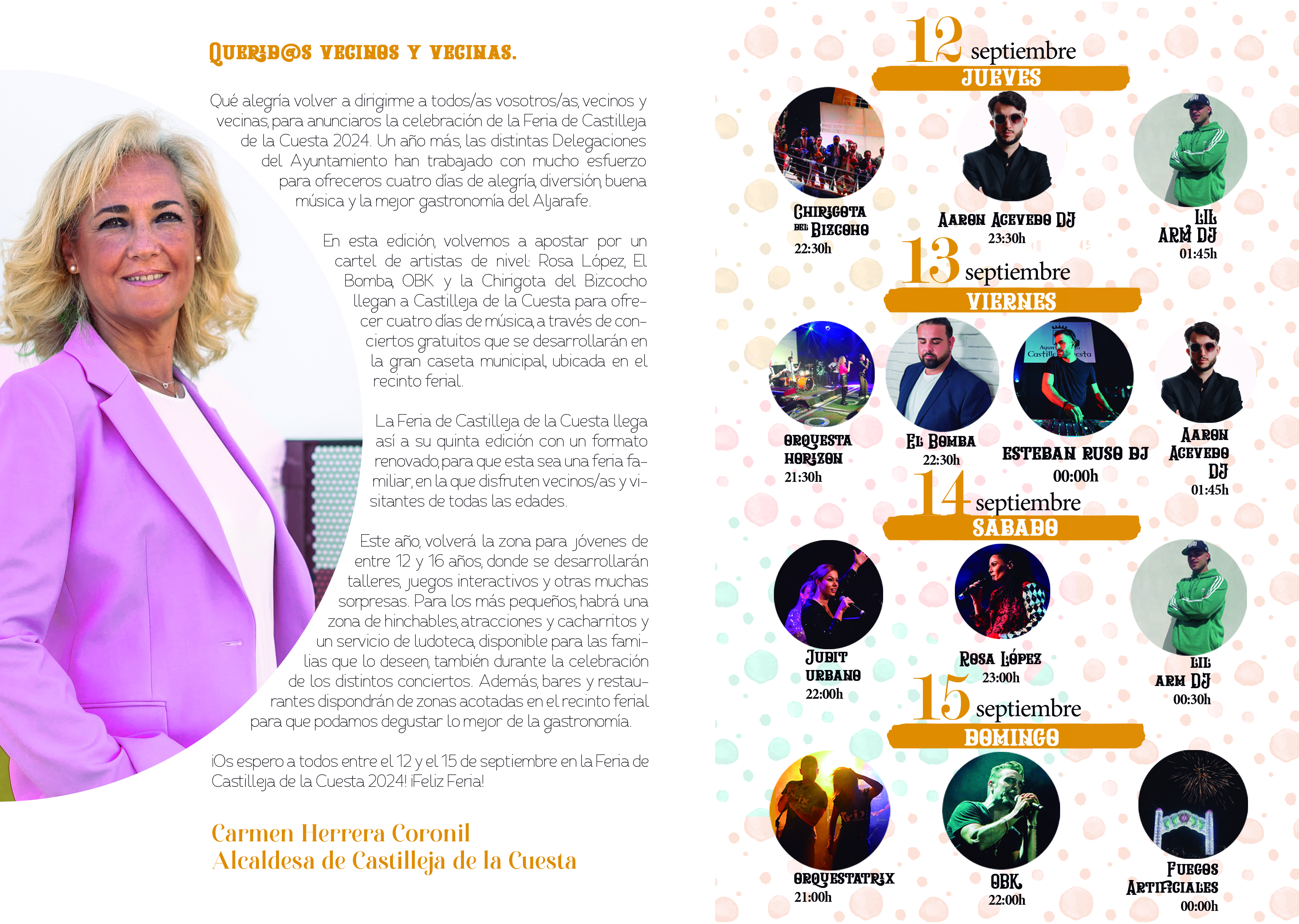 La Feria de Castilleja de la Cuesta llega a su quinta edición “con un formato renovado, pensado para un público de todas las edades y con artistas de primer nivel”, ha subrayado Herrera. Un año más, una gran carpa, ubicada en el recinto ferial de la Avenida Plácido Fernández Viagas, acogerá los conciertos de los artistas ya citados y de los DJ Lil Arm, Esteban Ruso y Aaron Acevedo y las Orquestas Horizon y Orquestatrix.