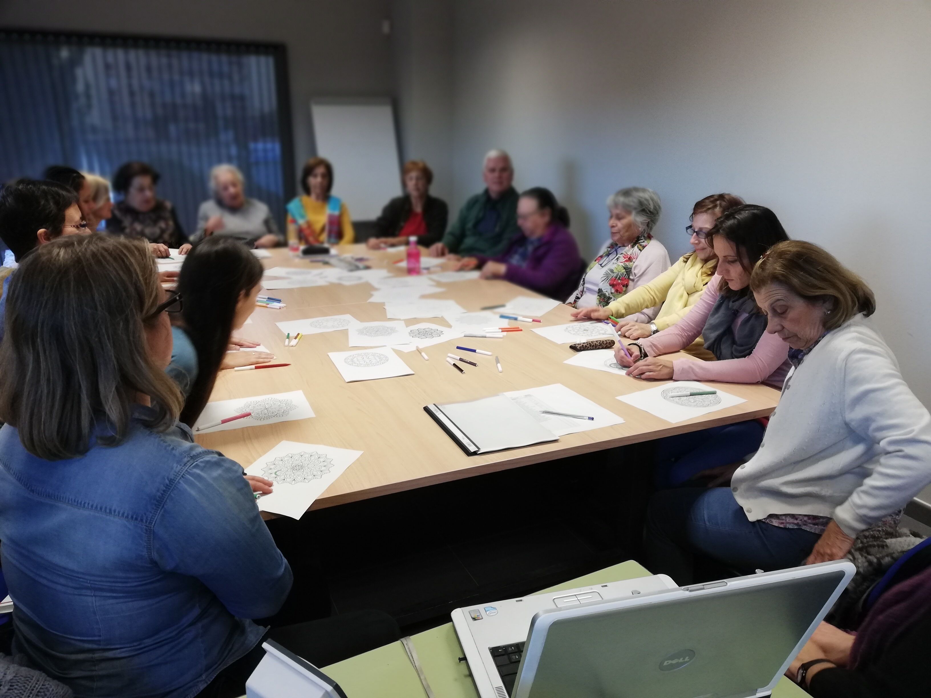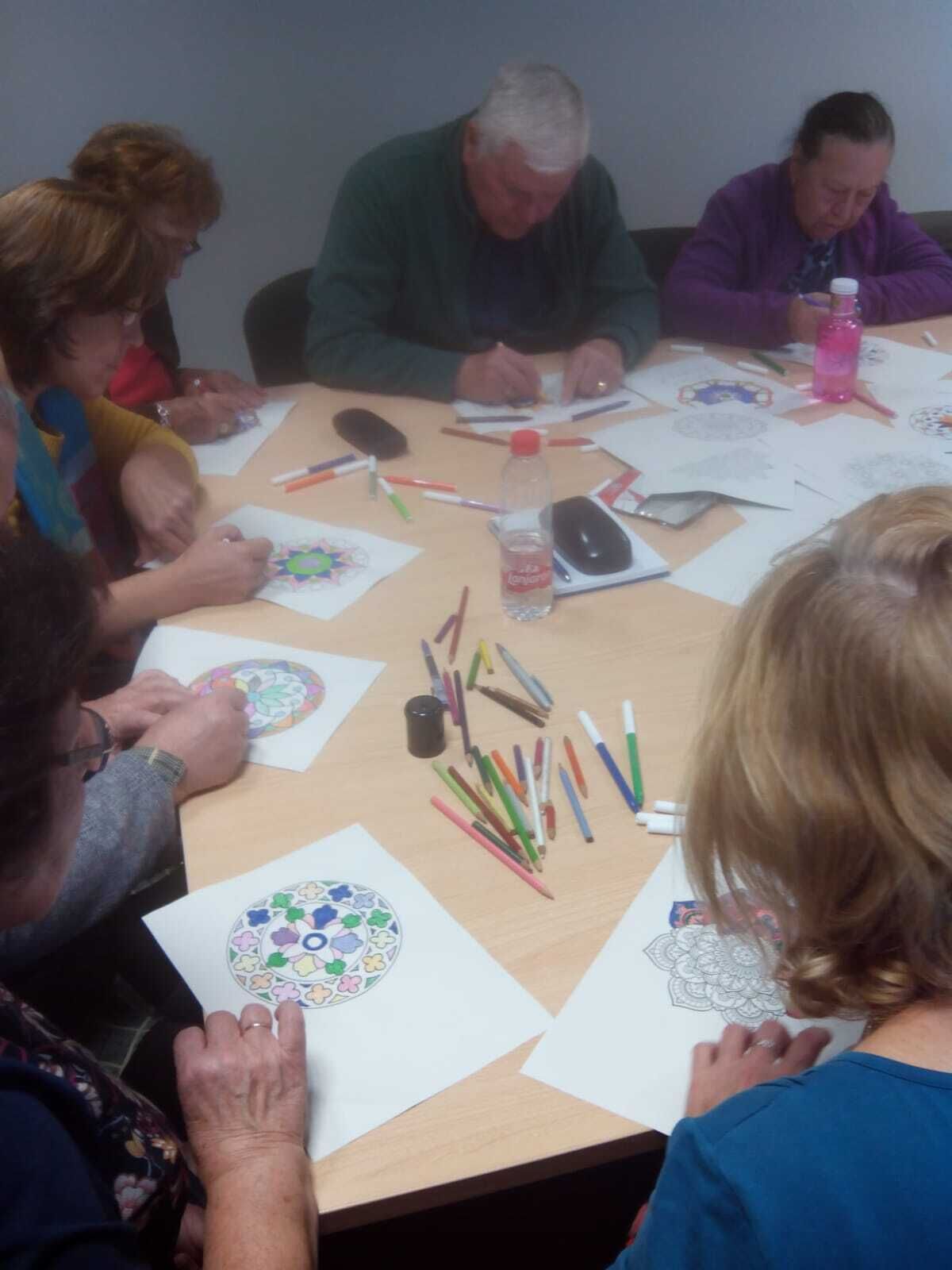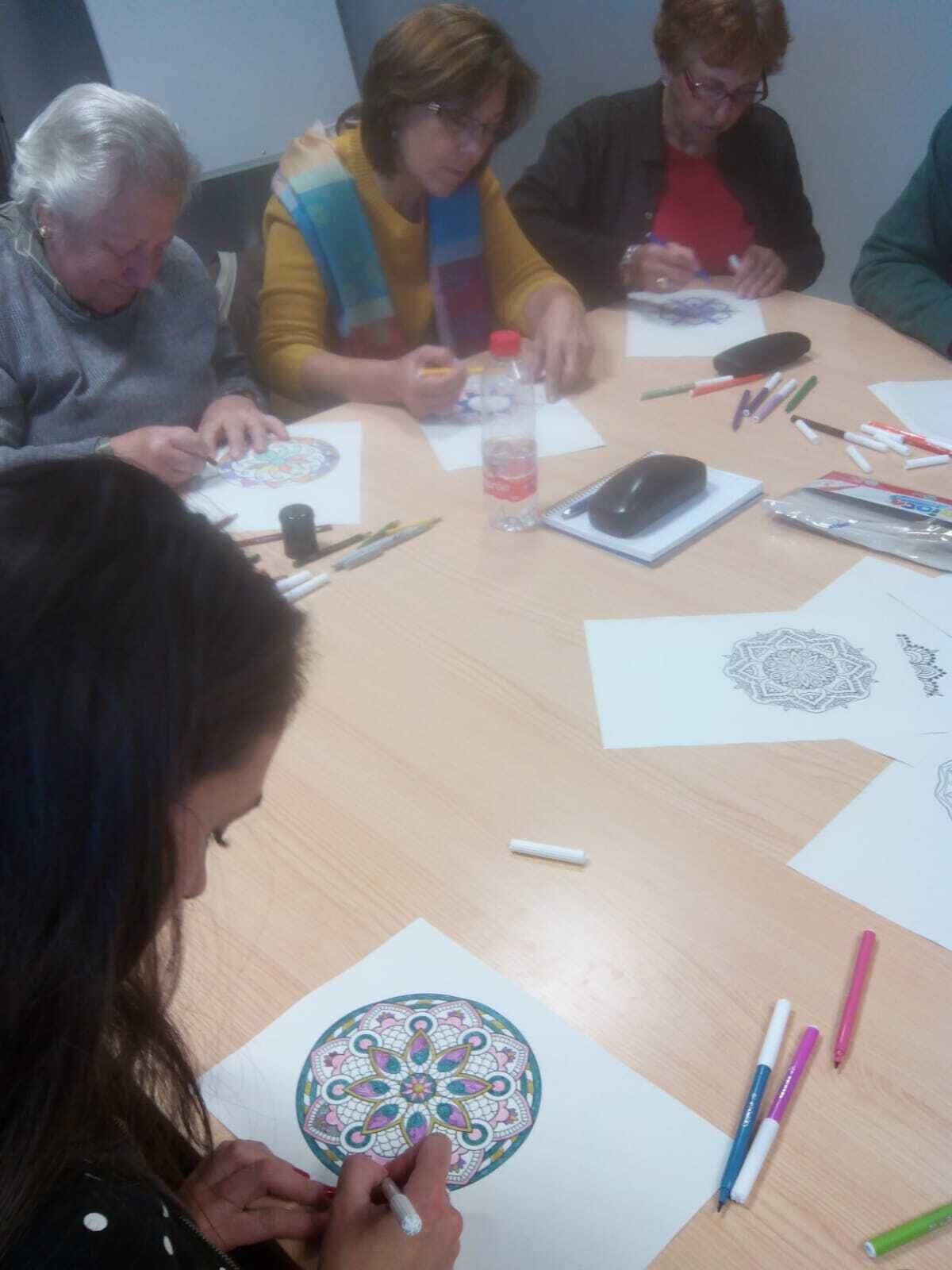 Las personas participantes han tenido la oportunidad de aprender qué significa el término mandala, “rueda o círculo”, y los orígenes de esta técnica de relajación, de origen hindú, reconocida como método para conseguir equilibrio espiritual a través de diversas formas geométricas (circular, cuadrada, lineal, triangular, mariposa, …): coloreando estos dibujos se puede trabajar el estado de ánimo del que se parte, en función del color con el que se empieza cada mandala.