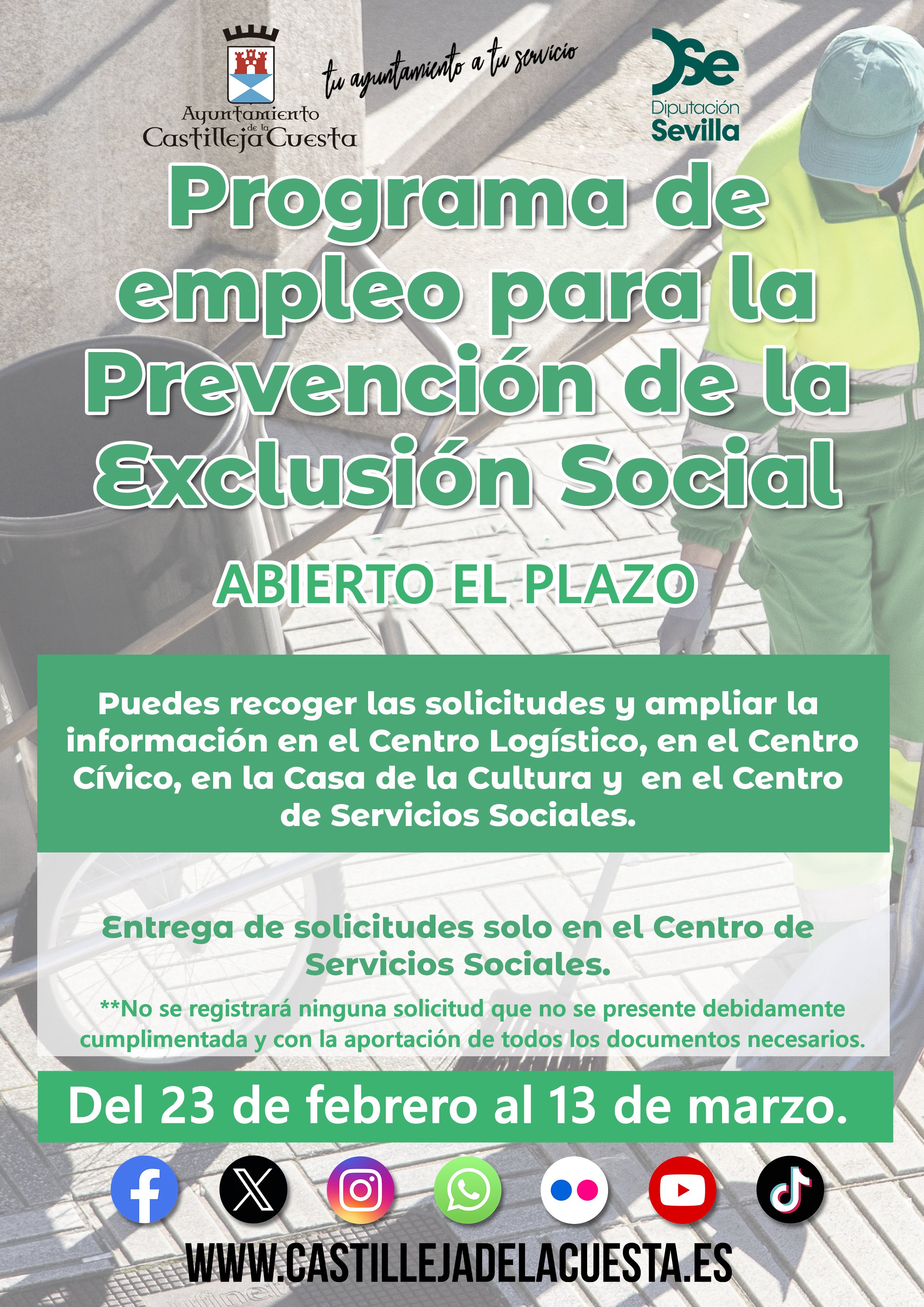 Abierto el plazo de solicitudes para el Programa de empleo para la prevención de la exclusión social, impulsado gracias a la Diputación de Sevilla, hasta el 13 de marzo.